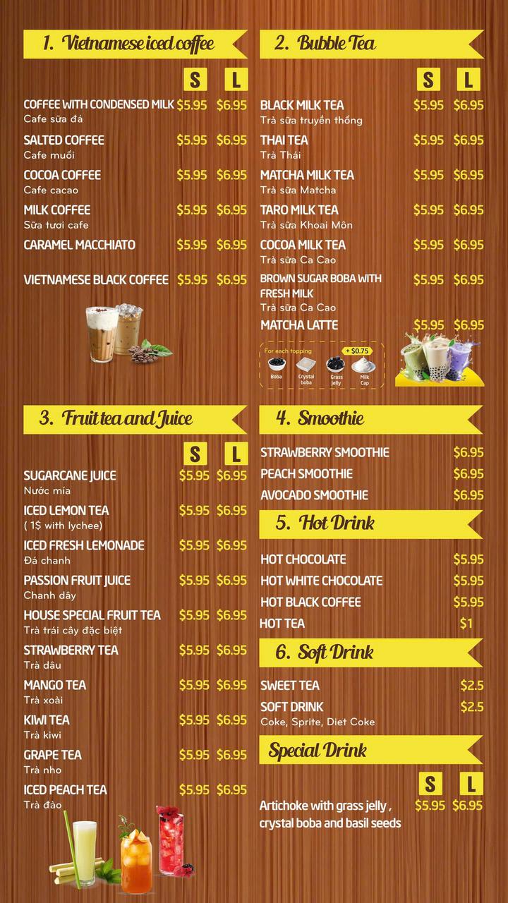 VN Sandwich tọa lạc tại 821 Concord Rd SE, Smyrna GA 30080 không chỉ phục vụ phở thơm lừng với nhiều lựa chọn đa dạng, mà còn khiến bạn "yêu ngay từ miếng đầu tiên" với chả giò giòn tan, bánh mì đủ loại, và cà phê Việt đậm đà đúng điệu. Thực đơn còn có trà sữa và nhiều loại trà trái cây mát lạnh, sẵn sàng làm dịu mọi cơn thèm!